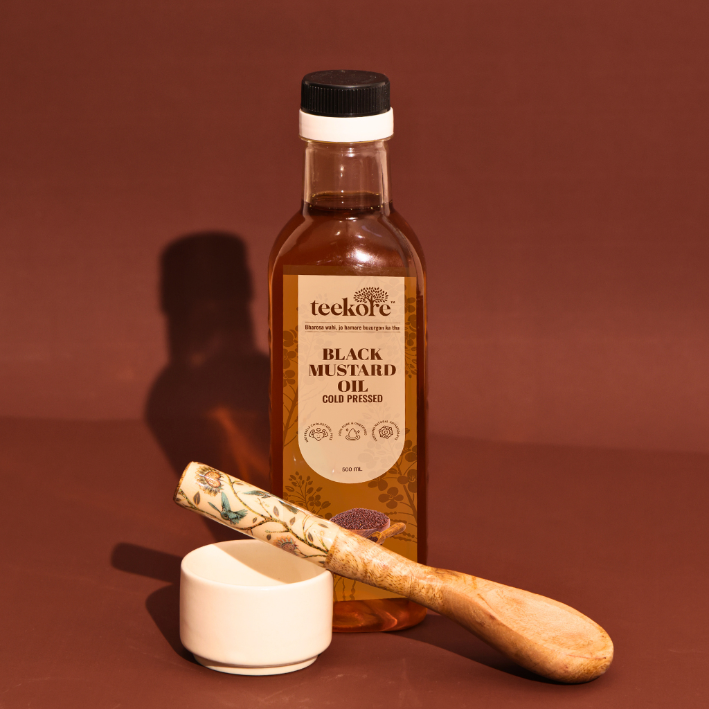 All the power of Teekore’s Cold-Pressed Black Mustard Oil, now in a handy 500ml bottle. This size is perfect for smaller households, gifting, or those who want to try out the authentic taste of traditional mustard oil in their daily cooking. Its strong aroma, rich flavor, and deep yellow hue make it ideal for pickles, tadkas, marinades, and massages alike.